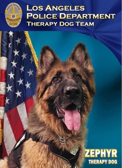 Zephyr is assigned to the Los Angeles Police Department's Therapy Dog Unit which is part of the Department's overall wellness program.